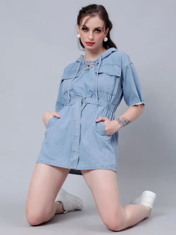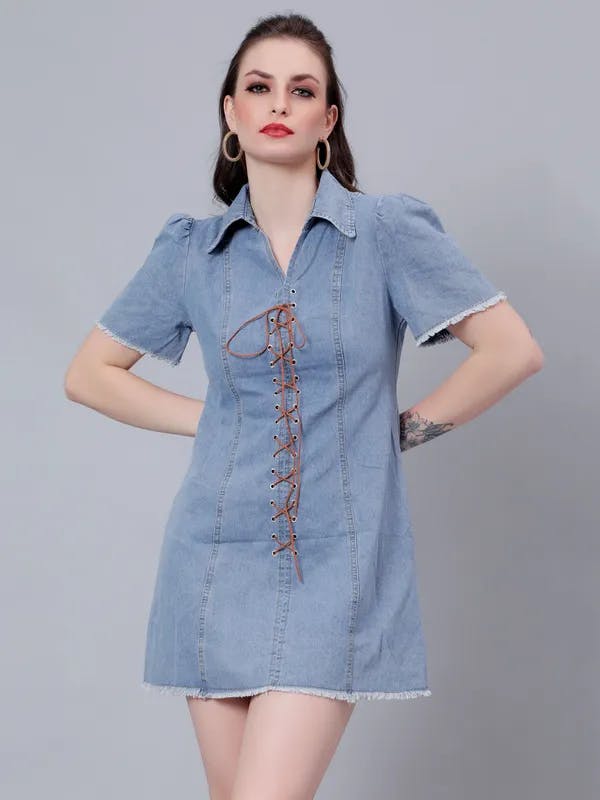 The denim mini dress is for the bold and fashion-forward. Often featuring a more fitted silhouette, this dress can come with exciting details like frayed hems, distressed elements, or off-the-shoulder necklines. It’s a statement piece that speaks to a more edgy, urban style. Style it with ankle boots and a leather jacket for a night out, or keep it cool and casual with sneakers and a denim jacket for daytime adventures.
