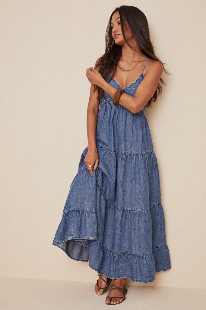 The denim maxi dress, with its floor-grazing length and relaxed fit, brings a bohemian flair to the denim collection. Look for features like tiered skirts, puff sleeves, and embroidered details to enhance the boho vibe. This dress is all about comfort and style, making it perfect for beach days, outdoor concerts, or any occasion where you want to make a relaxed yet stylish statement. Accessorize with a wide-brim hat, layered necklaces, and strappy sandals to complete the look.