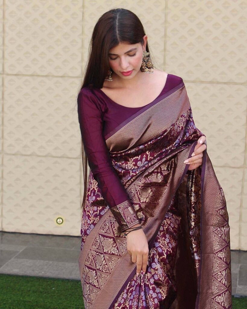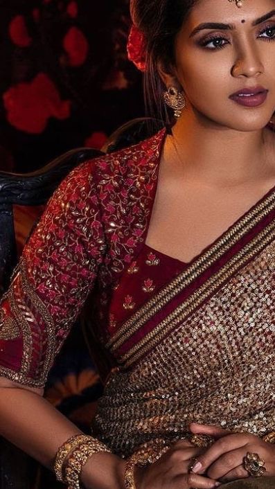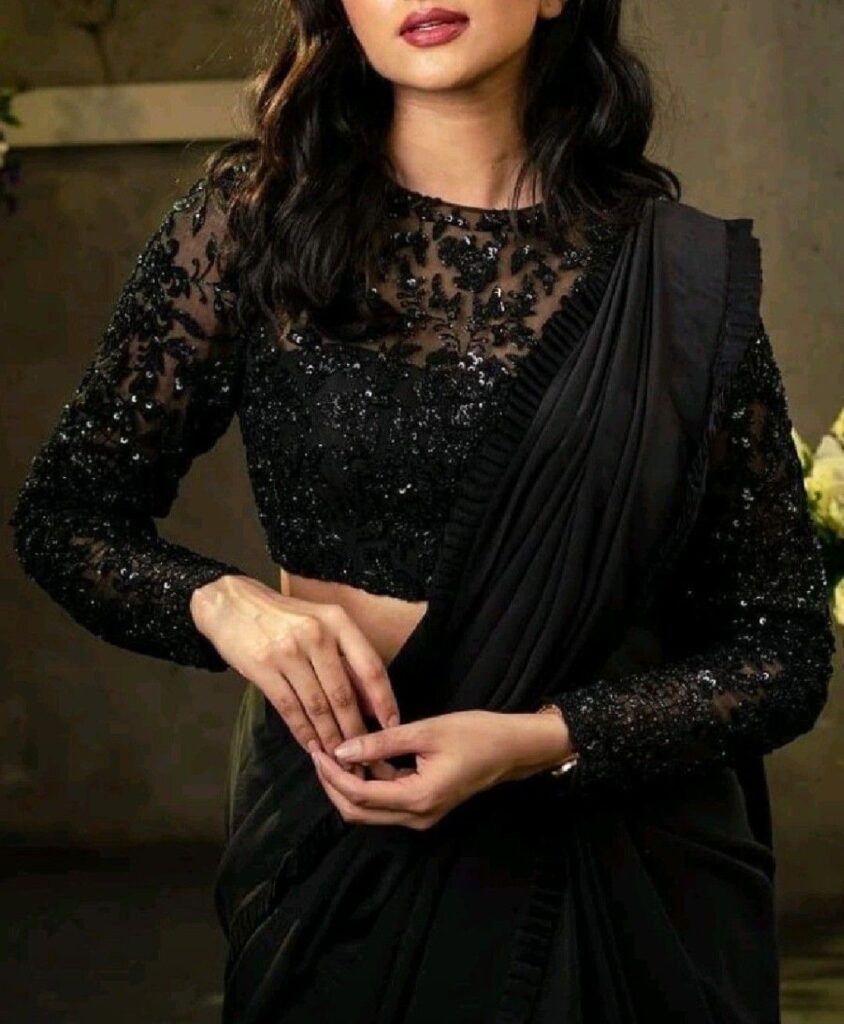 A full-sleeved blouse adorned with intricate embroidery is a timeless choice. Whether it’s the detailed zari work, colorful thread embroidery, or a mix of sequins and beads, these designs add depth and character to your outfit. Opt for a blouse with embroidery concentrated on the sleeves for a dramatic effect, ensuring you capture everyone’s attention.