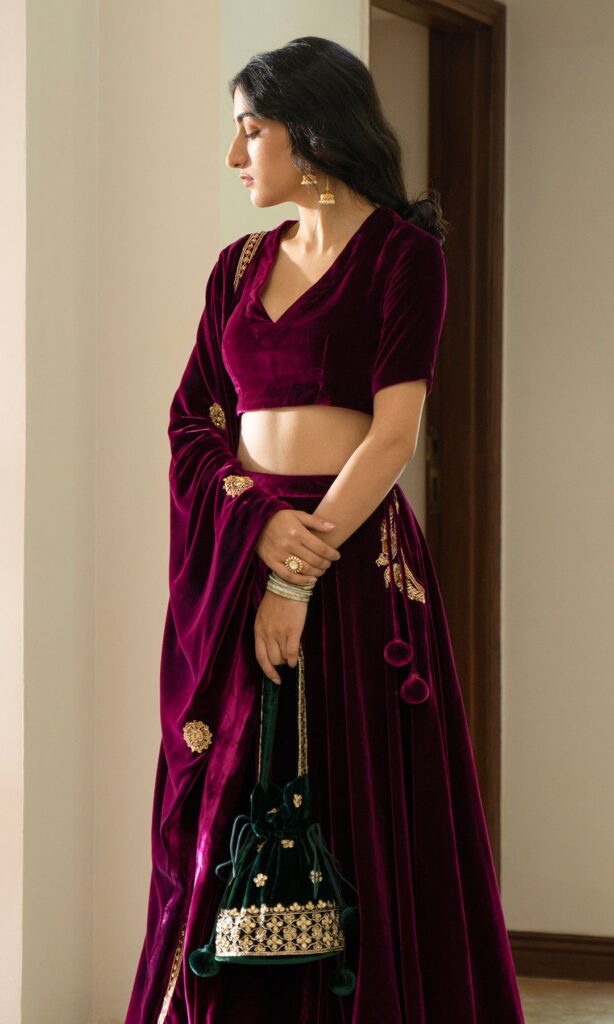 Velvet blouses with full sleeves are synonymous with luxury and opulence. Ideal for winter weddings, a deep-colored velvet blouse with gold or silver embroidery can elevate a simple lehenga or saree to regal heights. This design not only keeps you warm but also adds a rich texture and sheen to your overall look.