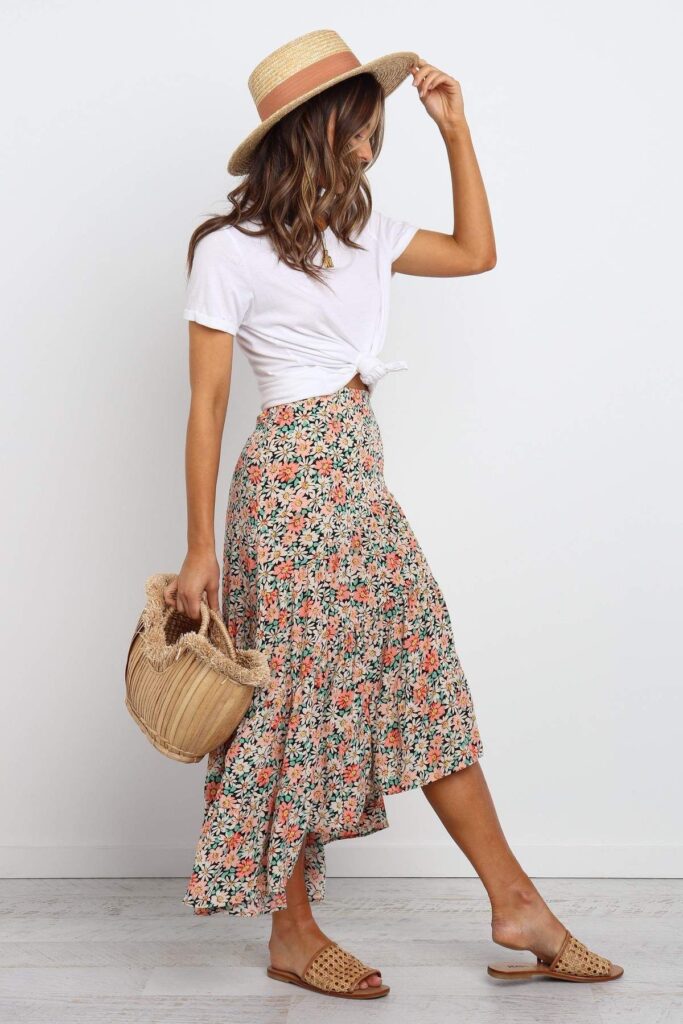 Nothing says spring like the effortless pairing of a classic white tee tucked into a flowy midi skirt. This combination is not only timeless but also versatile. Opt for a skirt with a vibrant print or a pastel hue to capture the essence of spring. Accessorize with a simple belt to cinch the waist and a pair of white sneakers or espadrilles for a casual yet polished look. This outfit can take you from a casual coffee date to an afternoon of shopping with ease.