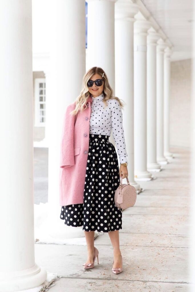 Color is a unifying factor when mixing patterns. Stick to a consistent color palette to make different prints work together harmoniously. If your polka dot blouse is black and white, try pairing it with a striped skirt featuring black or similar hues. This color connection will bring cohesiveness to your outfit.